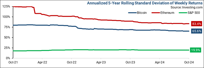 The substantial price gains and steep corrections seen in cryptocurrencies underscore the extreme volatility in their long-term returns. For instance, over the past five years, Ethereum and Bitcoin have exhibited annualized volatility exceeding 80% and 60%, respectively, in contrast to approximately 20% for the S&P 500 Index. Although the long-term volatility of Ethereum and Bitcoin has moderated in recent years, it may take a considerable amount of time—if ever—before these assets demonstrate volatility levels comparable to traditional equities.