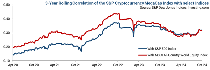 Cryptocurrencies have shown a consistently low correlation with traditional financial markets, making them appear as a means to achieve overall portfolio diversification. For example, the correlation coefficient between the S&P Cryptocurrency MegaCap Index (an index designed to track the performance of Bitcoin and Ethereum) and the S&P 500 Index has generally ranged between 0.2 and 0.4 when observed for 5-year periods. This low correlation implies the price movements of the two cryptocurrencies are largely independent of the performance of the broader equity markets, theoretically offering diversification benefits. However, in this case, the low correlation least likely guarantees effective diversification, especially given the high volatility and downside risks associated with cryptocurrencies.