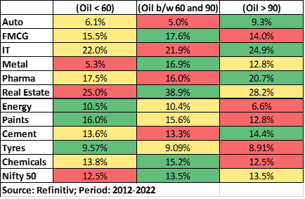 From a stock market perspective, higher oil price tends to affect some sectors directly and many other sectors indirectly. (Table) However, many of them might experience lags, as they need pass through time. Sometimes companies may decide to live with lower margins in order to protect the market share or market conditions may not be conducive to pass on the cost increase. While others may enjoy significant pricing power (due to market leadership) and hence may have a lower impact. Sectors like Paints, Tyres, Aviation, Chemicals and Logistics will have a direct and immediate impact while sectors like Cement, FMCG and Discretionary can have lag effects. Nearly 60% of raw material costs are accounted for by oil and oil derivatives for Paints and Tyres. For Aviation, 40% of raw material cost is accounted by Aviation Turbine Fuel (ATF). Based on a study of quarterly data since 2012, we can see that most of the sensitive sectors felt the heat of lower margins though we can notice some exceptions as well. For e.g., sectors like Auto, Information Technology, Pharma and Cement enjoy margin increases during a high oil price regime while sectors like FMCG, Energy, Paints, Tyres and Chemicals suffer margin erosion during a high oil price scenario. It will be instructive to underweight these sectors in times of high oil prices.
