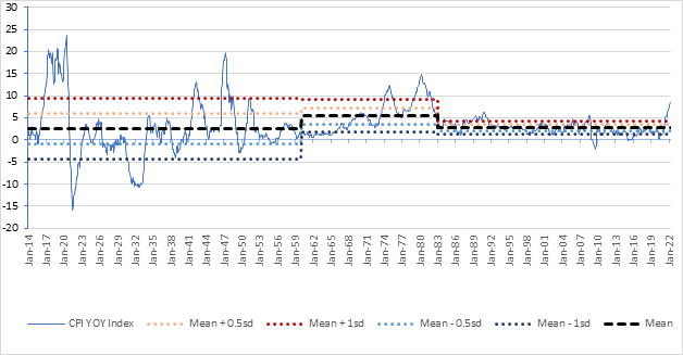 Given 3 distinct structural regimes in inflation over the last century, it is imperative for any historical analysis to take into account these regime changes. To do this, we have categorized inflation into five different sub-regimes within each of the 3 structural regimes: