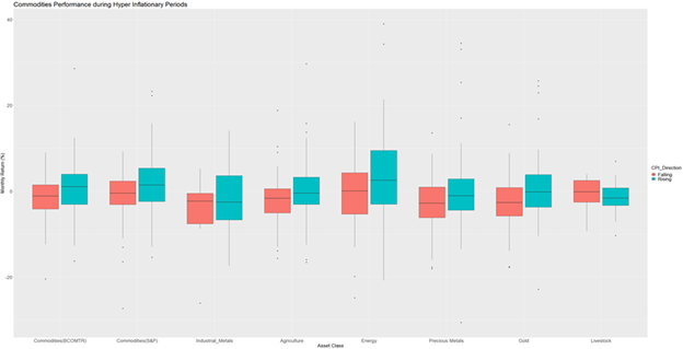 - Commodities do quite well as a short term inflation hedge. We also further breakdown Commodities into underlying components and observe the same trends in rising and falling hyperinflationary regimes. We also compute Hit Rates for different asset classes which further favor Commodities (>60%) as a better short term hedge for inflation.