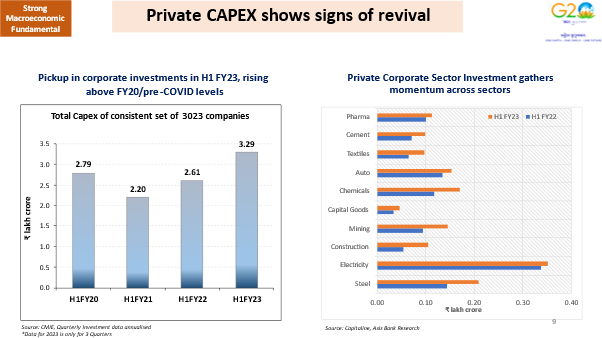 Private capex continues to show good revival. There has been a pickup in in corporate investments in H1 FY23, rising above FY20/pre-COVID levels.