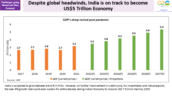 - Despite the global headwinds, India is on track to become a $5 trillion economy. According to the CEA’s estimates, Indian economy is likely to surpass this mark in 2027.