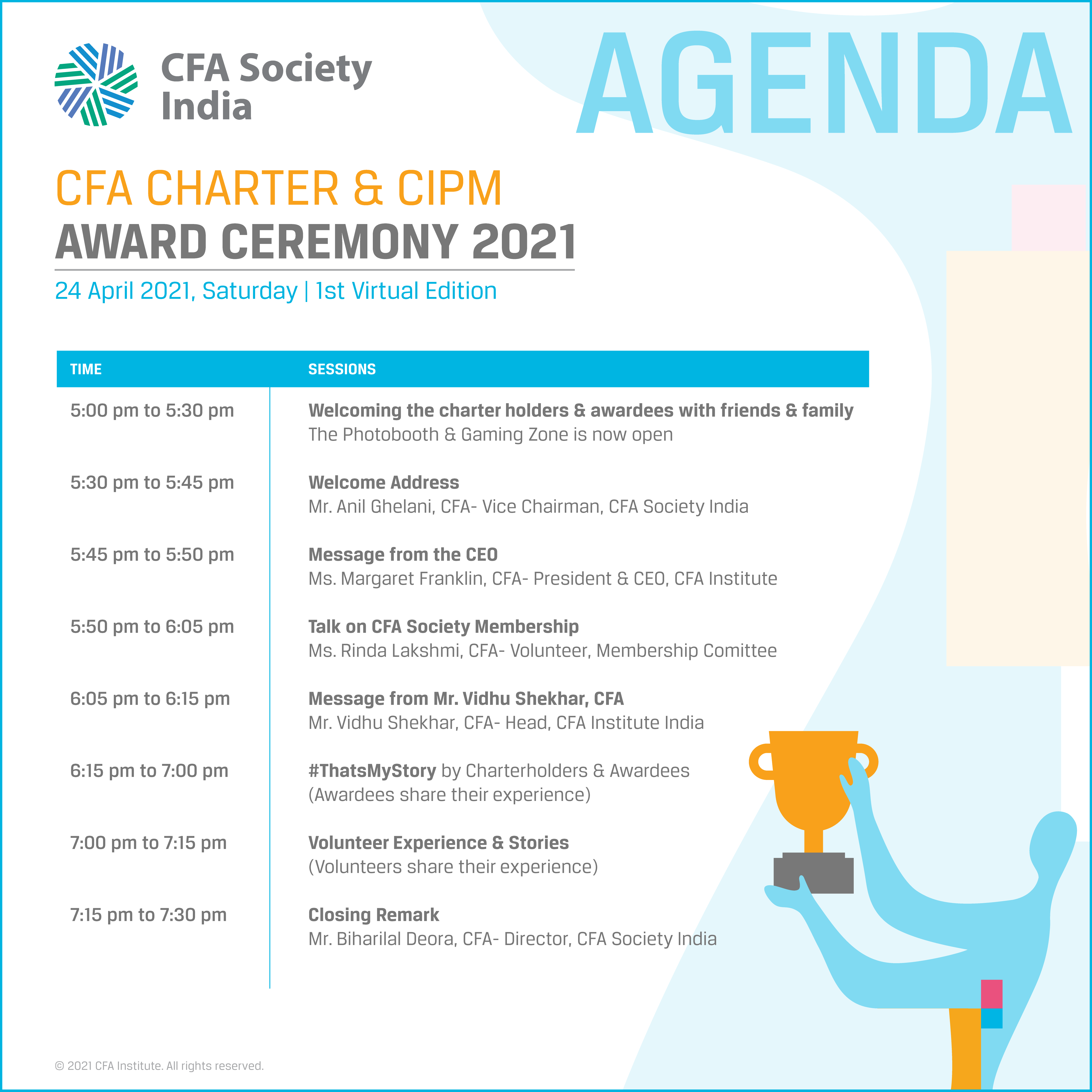 CFA Charter and CIPM Award Ceremony 2021 April 24, 2021 5.30 - 7.30 .pm. Online Agenda Register Now Overview SHARE[addtoany] 2021-4-24 5.30 pm 2021-4-24 7:30 pm Asia/Kolkata CFA Charter and CIPM Award Ceremony 2021 Online Save Event to Calendar past event 0
