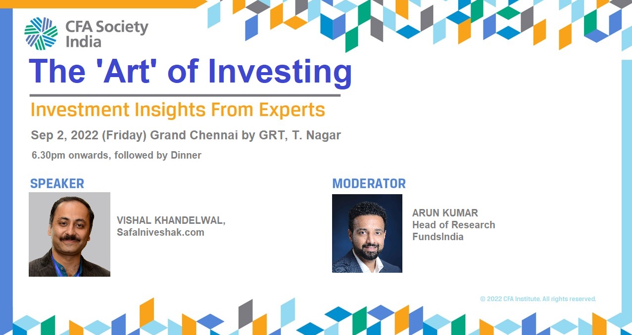 CFA Society India is pleased to invite you for a session with Vishal Khandelwal, founder of SafalNiveshak.com where he will discuss The “Art” of Investing. The session will be moderated by Arun Kumar, Head of Research, FundsIndia.com (& EightyTwentyInvestor.com)