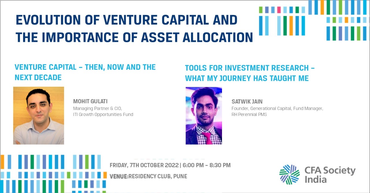 CFA Society India is pleased to invite you for a session with Satwik Jain, Founder – Generational Capital, Fund Manager – RH Perennial PMS and Mohit Gulati, CIO & Managing Partner – ITI Venture Capital. They will discuss the evolution of asset allocation and venture capital and what its future in India