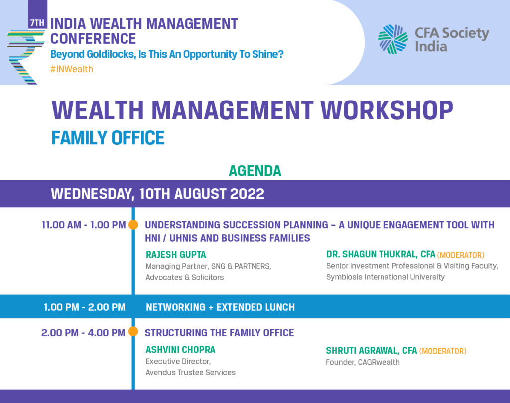 To help nurture talent on these topics, we are offering a specialized workshop on 10th August, 2022 at Boundary hall, MCA, BKC . The full day workshop will provide an in-depth understanding on succession planning and family office businesses. Veteran experts in this field – Ashvini Chopra and Rajesh Gupta will lead the sessions. Detailed learning outcomes here.